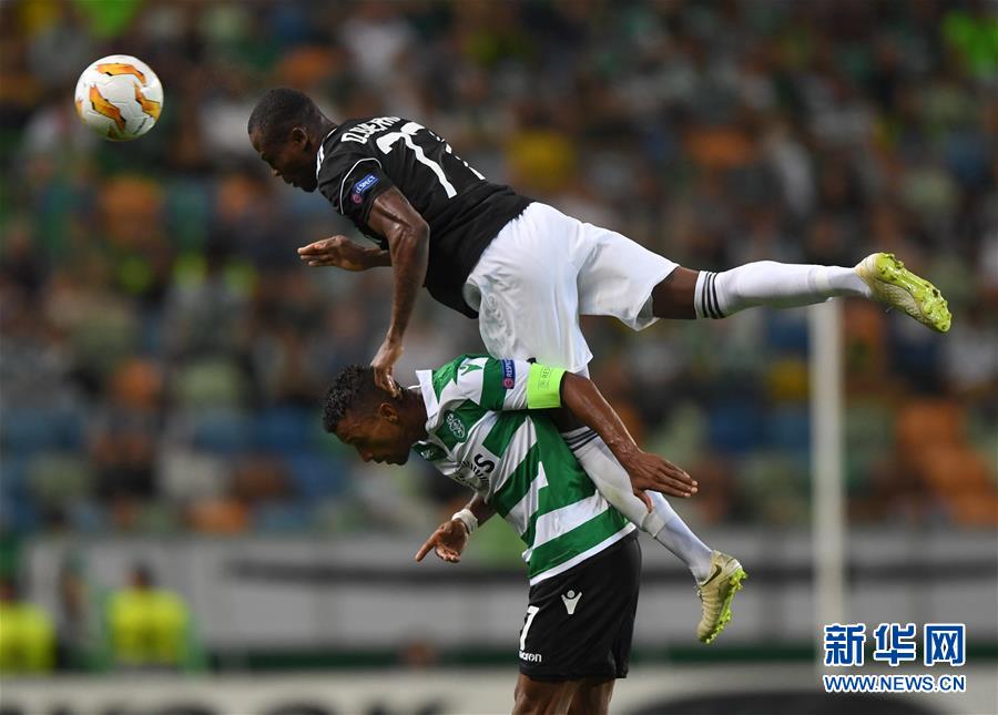 9月20日,卡拉巴赫队球员盖里耶(上)与葡萄牙体育队球员纳尼在比赛中拼抢。新华社记者张立云摄
