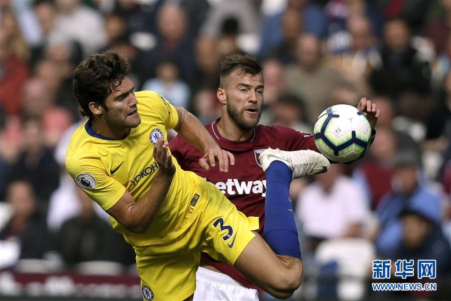 ↑9月23日,切尔西队球员阿隆索(左)与西汉姆联队球员亚尔莫连科在比赛中拼抢。新华社/美联