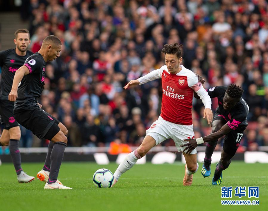 ↑9月23日,阿森纳队球员厄齐尔(中)在比赛中突破。新华社发(马雷克摄)