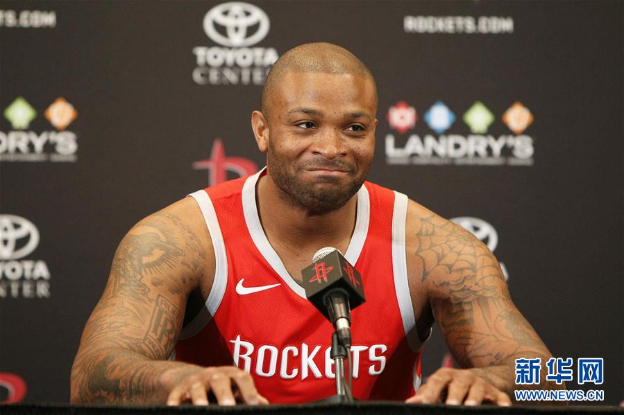 9月24日,火箭队球员塔克回答记者提问。 新华社发(宋穹摄)