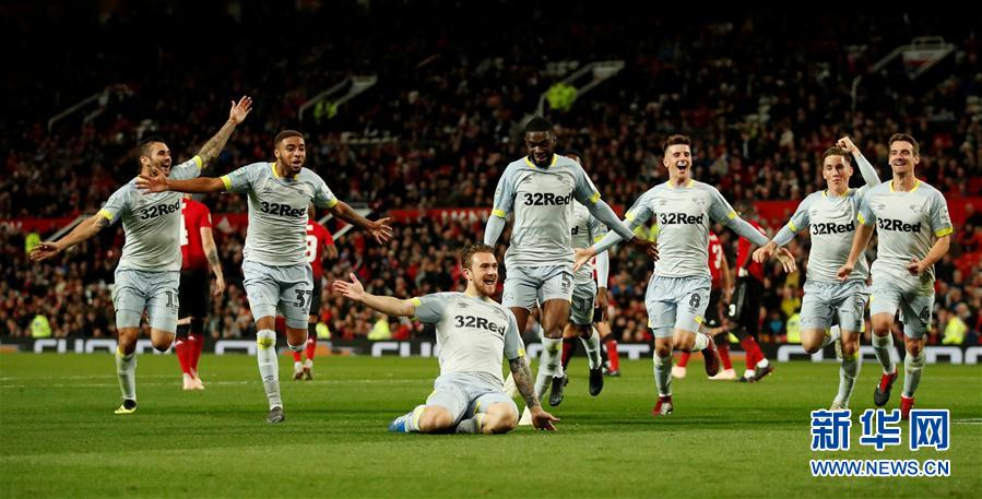 9月25日,德比郡队球员庆祝比赛胜利。 当日,在2018-2019赛季英格兰联赛杯第三轮比赛中,英超曼联队与英冠德比郡队在90分钟常规时间内以2比2战平,随后在点球大战中曼联队以7比8不敌德比郡队,被淘汰出局。 新华社/路透