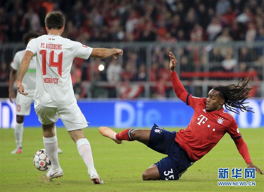 9月25日,拜仁慕尼黑队球员桑谢斯(右)与奥格斯堡队球员莫拉维克在比赛中拼抢。 当日,在2018-2019赛季德国足球甲级联赛第五轮比赛中,拜仁慕尼黑队主场以1比1战平奥格斯堡队。 新华社发(菲利普·鲁伊兹摄)