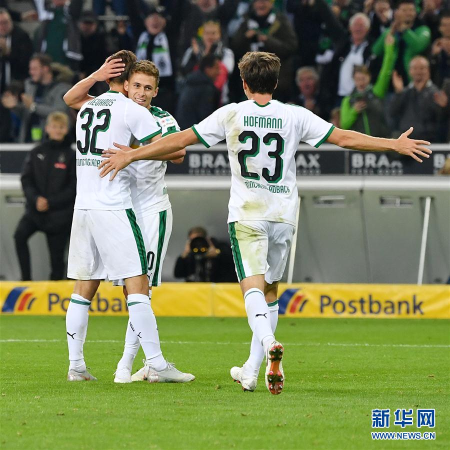 9月26日,门兴格拉德巴赫队球员索尔根·阿扎尔(中)在比赛中庆祝进球。 新华社发(乌尔里希·胡夫纳格尔摄)