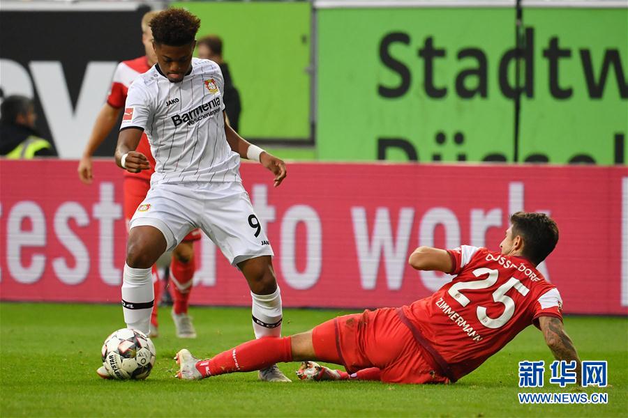 9月26日,勒沃库森队球员莱昂·贝利(左)与杜塞尔多夫队球员齐默尔曼在比赛中拼抢。 新华社发(乌尔里希·胡夫纳格尔摄)