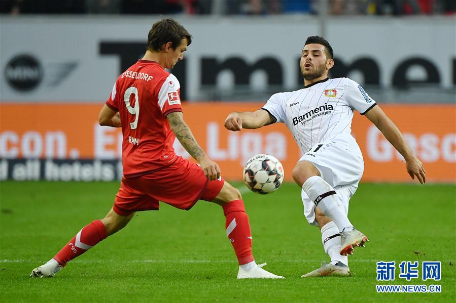 9月26日,勒沃库森队球员弗兰德(右)与杜塞尔多夫队球员拉曼在比赛中拼抢。 新华社发(乌尔里希·胡夫纳格尔摄)
