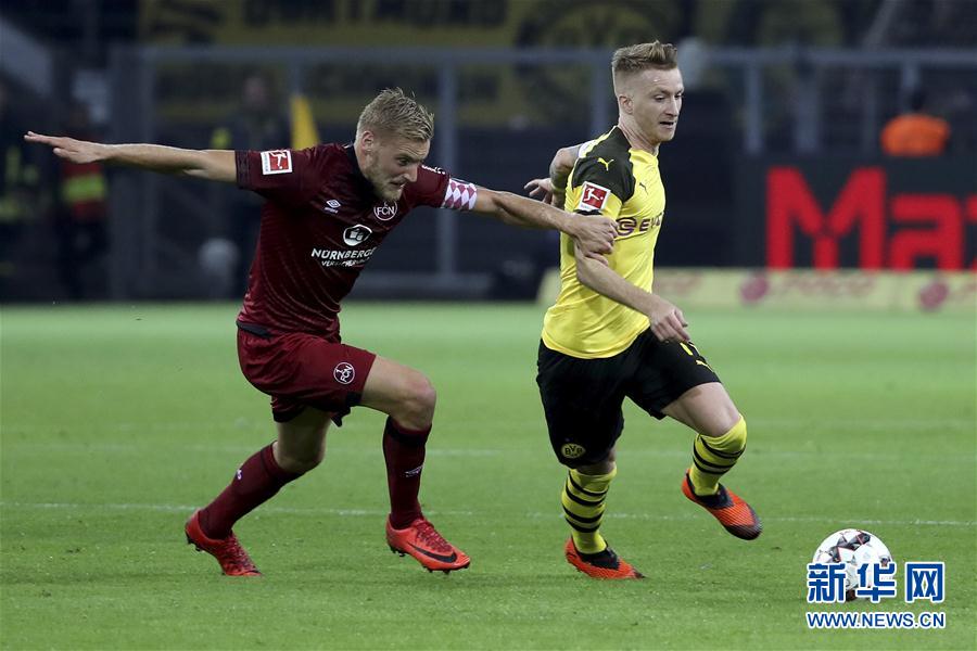 9月26日,多特蒙德队球员罗伊斯(右)和纽伦堡队球员贝伦斯在比赛中拼抢。 新华社发(约阿希姆·毕瓦勒兹摄)