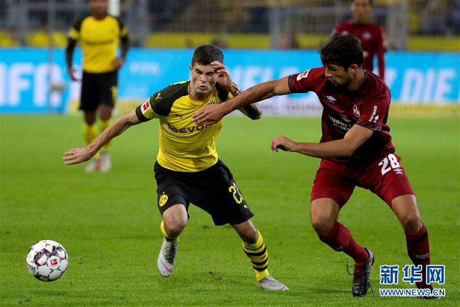 9月26日,多特蒙德队球员普利西奇(左)与纽伦堡队球员卢卡斯在比赛中拼抢。 新华社发(约阿希姆·毕瓦勒兹摄)