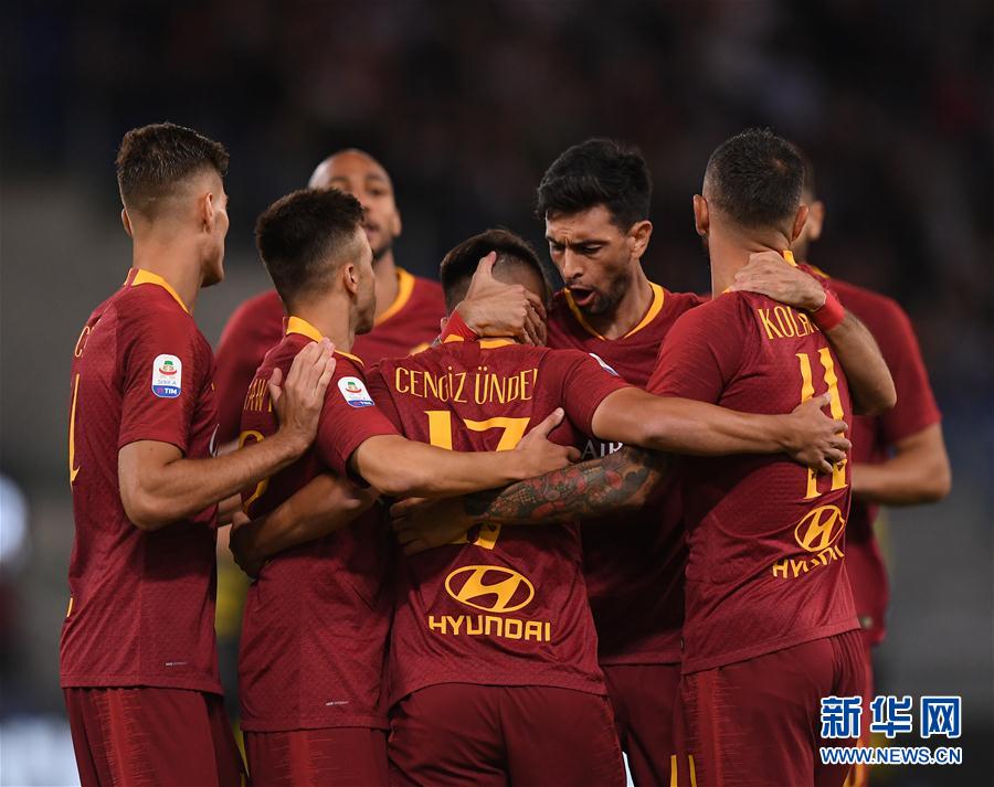 9月26日,罗马队球员乌德尔(前中)和队友庆祝进球。 当日,在2018-2019赛季意大利足球甲级联赛第六轮比赛中,罗马队主场以4比0战胜弗罗西诺内队。 新华社发(阿尔贝托·林格里亚摄)