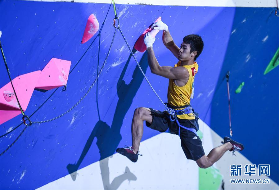 9月28日,中国香港攀山及攀登总会代表队选手陈翔志在男子难度赛决赛中。最终,陈翔志获得该项目冠军。 当日,第26届全国攀岩锦标赛男子难度赛决赛在贵州省黔西南布依族苗族自治州安龙县举行。 新华社记者陶亮摄