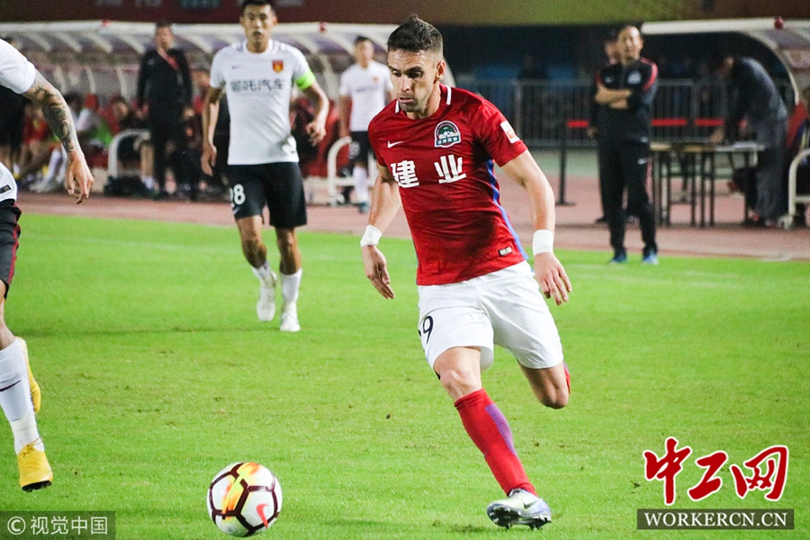 中工网讯 9月29日晚,2018中超联赛第24轮全面打响。河南建业主场迎战华夏幸福,最终凭借外援卡兰加和伊沃的进球,建业队以2∶0击败河北华夏幸福取得近八轮比赛的首场胜利。此役之前,河南建业6负1平,保级压力巨大。此战也是新帅王宝山接替刚刚下课的张外龙的首场比赛,换帅如换刀,在联赛还剩六轮的情况下,河南建业如愿取得保级路上的关键胜利,同时也使得降级球队再生变数。图为河南建业外援伊沃传球