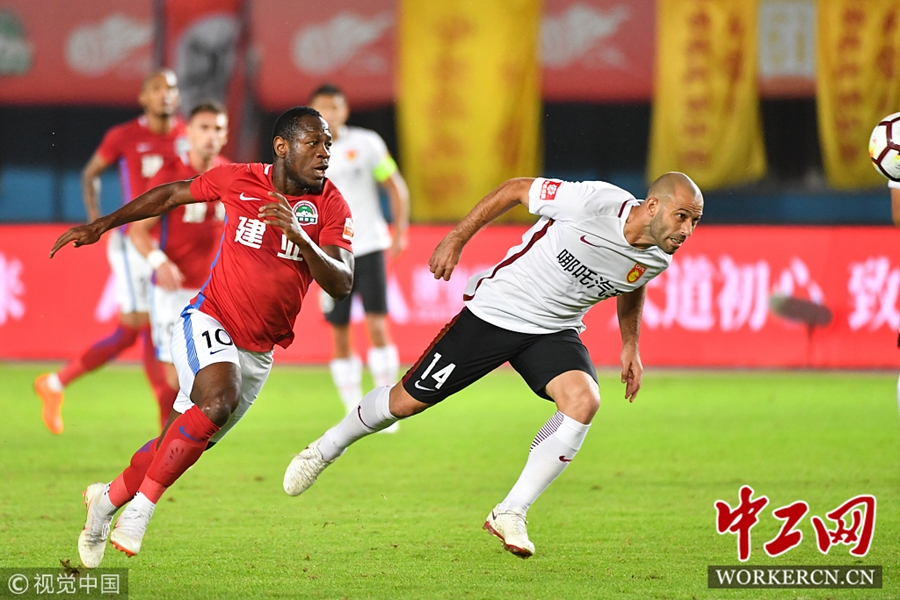 中工网讯 9月29日晚,2018中超联赛第24轮全面打响。河南建业主场迎战华夏幸福,最终凭借外援卡兰加和伊沃的进球,建业队以2∶0击败河北华夏幸福取得近八轮比赛的首场胜利。此役之前,河南建业6负1平,保级压力巨大。此战也是新帅王宝山接替刚刚下课的张外龙的首场比赛,换帅如换刀,在联赛还剩六轮的情况下,河南建业如愿取得保级路上的关键胜利,同时也使得降级球队再生变数。图为巴索戈,马斯切拉诺拼抢