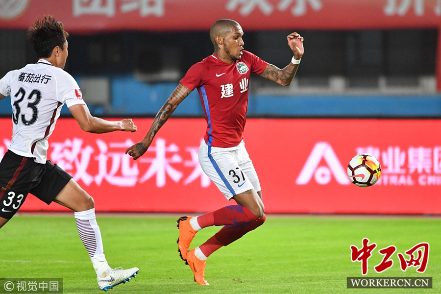 中工网讯 9月29日晚,2018中超联赛第24轮全面打响。河南建业主场迎战华夏幸福,最终凭借外援卡兰加和伊沃的进球,建业队以2∶0击败河北华夏幸福取得近八轮比赛的首场胜利。此役之前,河南建业6负1平,保级压力巨大。此战也是新帅王宝山接替刚刚下课的张外龙的首场比赛,换帅如换刀,在联赛还剩六轮的情况下,河南建业如愿取得保级路上的关键胜利,同时也使得降级球队再生变数。图为河南建业外援卡兰