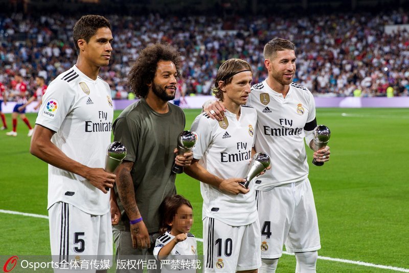 瓦拉内、马塞洛、莫德里奇、拉莫斯展示欧洲最佳阵容奖杯