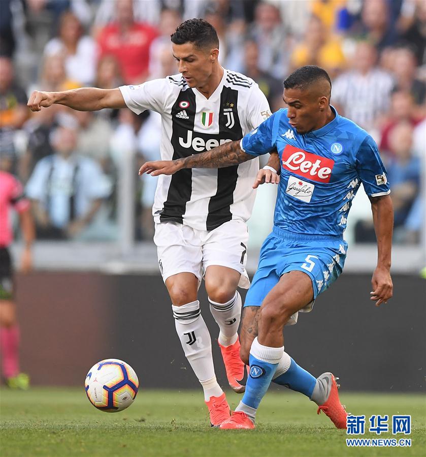 ↑9月29日,尤文图斯队球员克里斯蒂亚诺·罗纳尔多(左)在比赛中与那不勒斯队球员阿兰拼抢。 当日,在2018-2019赛季意大利足球甲级联赛第七轮比赛中,尤文图斯队主场以3比1战胜那不勒斯队。 新华社发(阿尔贝托·林格里亚摄)
