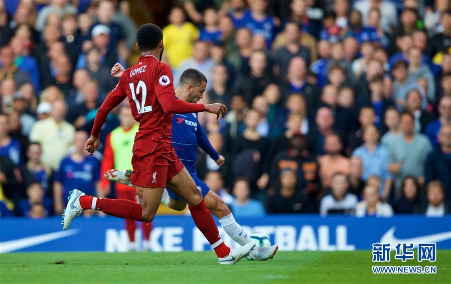 ↑9月29日,切尔西队球员阿扎尔(右)在比赛中射门得分。 当日,在2018-2019赛季英格兰足球超级联赛第七轮比赛中,切尔西队主场以1比1战平利物浦队。 新华社发