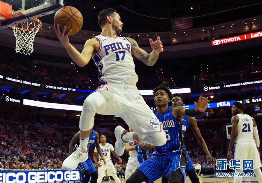 10月1日,76人队球员雷迪克(左)在比赛中救球。 当日,在NBA季前赛中,费城76人队主场以120比114战胜奥兰多魔术队。 新华社/路透