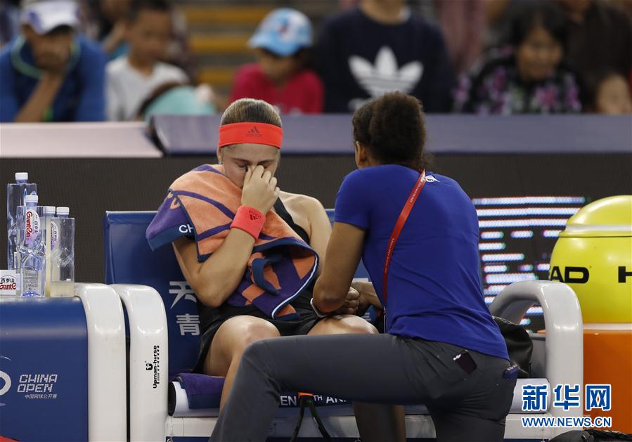 10月2日,奥斯塔彭科在场边接受治疗。 当日,在2018年中国网球公开赛女单第二轮比赛中,中国选手王蔷以2比0战胜拉脱维亚选手奥斯塔彭科,晋级下一轮。 新华社发(贾浩成摄)