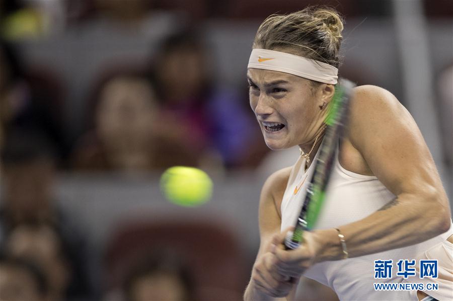 10月2日,萨巴伦卡在比赛中回球。 当日,在2018年中国网球公开赛女单第二轮比赛中,西班牙选手穆古拉扎以0比2不敌白俄罗斯选手萨巴伦卡,无缘下一轮。 新华社记者费茂华摄