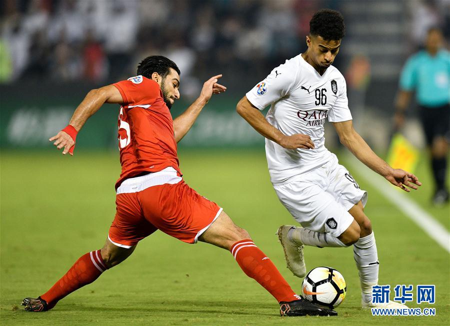 10月2日,阿尔萨德队球员阿菲福(右)与波斯波利斯队球员细亚马克在比赛中争抢。 当日,在卡塔尔首都多哈进行的2018年亚冠联赛半决赛首回合比赛中,卡塔尔阿尔萨德队主场以0比1不敌伊朗波斯波利斯队。 新华社发(尼库摄)