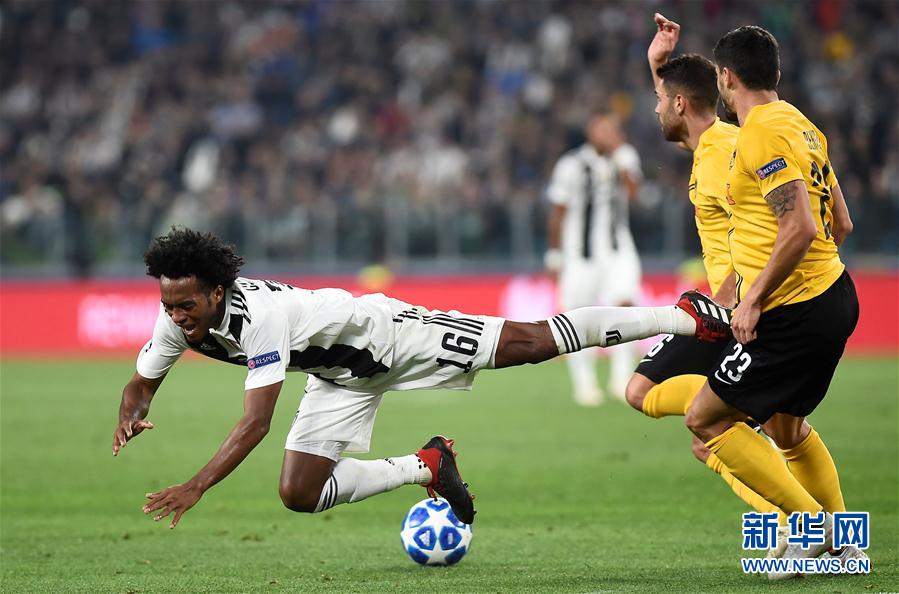 10月2日,尤文图斯队球员夸德拉多(左)在比赛中倒地。 当日,在2018-2019赛季欧洲足球冠军联赛H组第二轮比赛中,意甲尤文图斯队主场以3比0战胜瑞超伯尔尼年轻人队。 新华社/路透