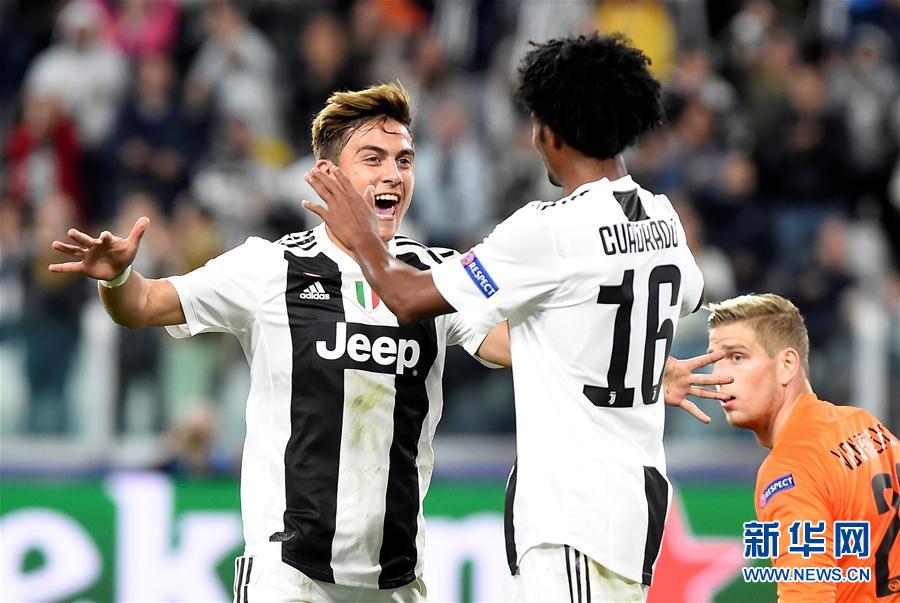 10月2日,尤文图斯队球员迪巴拉(左)进球后与队友夸德拉多(中)庆祝。 当日,在2018-2019赛季欧洲足球冠军联赛H组第二轮比赛中,意甲尤文图斯队主场以3比0战胜瑞超伯尔尼年轻人队。 新华社/路透