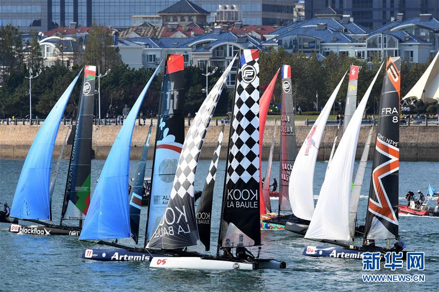 10月3日,各队帆船在训练赛中。 当日,在青岛奥帆中心进行的2018国际极限帆船系列赛青岛站比赛落下帷幕。最终,来自新西兰的汉密尔顿华斯队以110分的总成绩获得第一名。 新华社记者李紫恒摄
