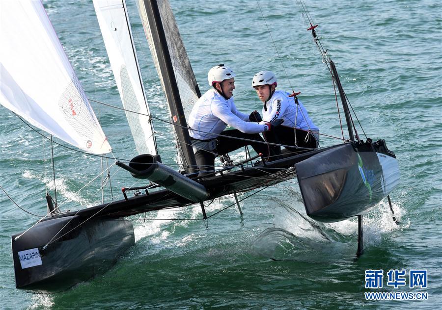 10月3日,来自中国香港的复制组合队帆船在训练赛中。新华社记者李紫恒摄
