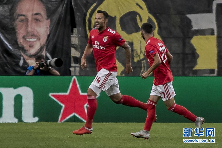 10月2日,本菲卡队球员塞费罗维奇(左)在比赛中庆祝进球。 当日,在2018-2019赛季欧冠小组赛E组第二轮比赛中,葡超本菲卡队客场以3比2战胜希超雅典AEK队。 新华社发(帕纳约蒂斯摄)