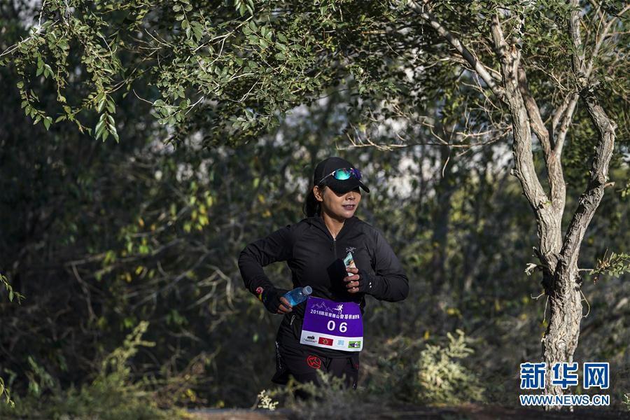 10月4日,46岁的跑步爱好者赵水英在比赛中穿越林间赛段。 新华社记者胡虎虎摄