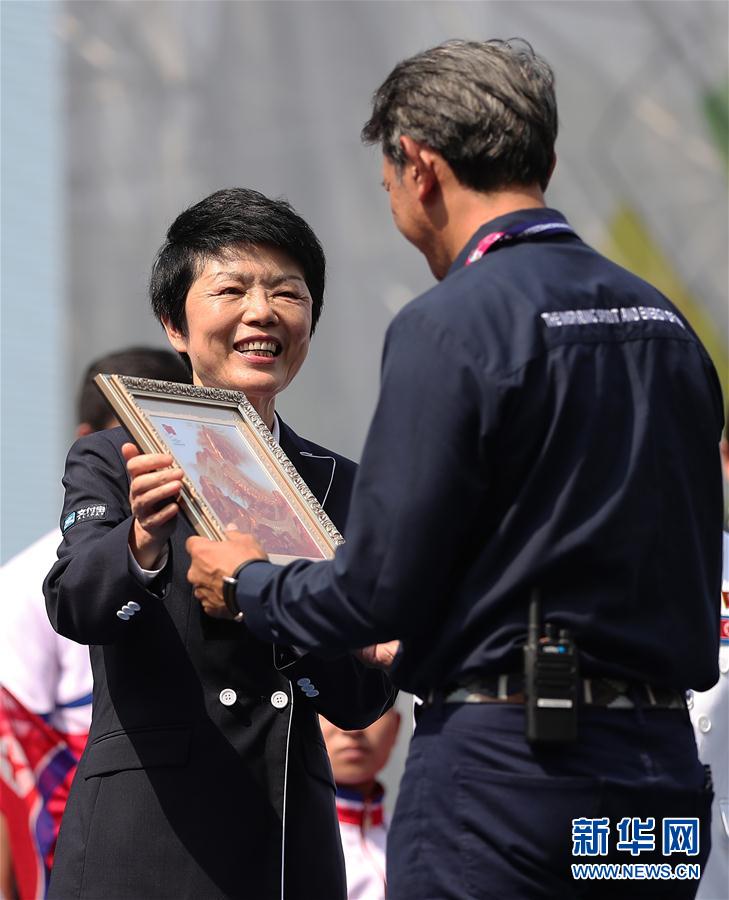 10月4日,中国体育代表团副团长王梅梅(左)和运动员村村长交换礼物。 新华社记者王东震摄