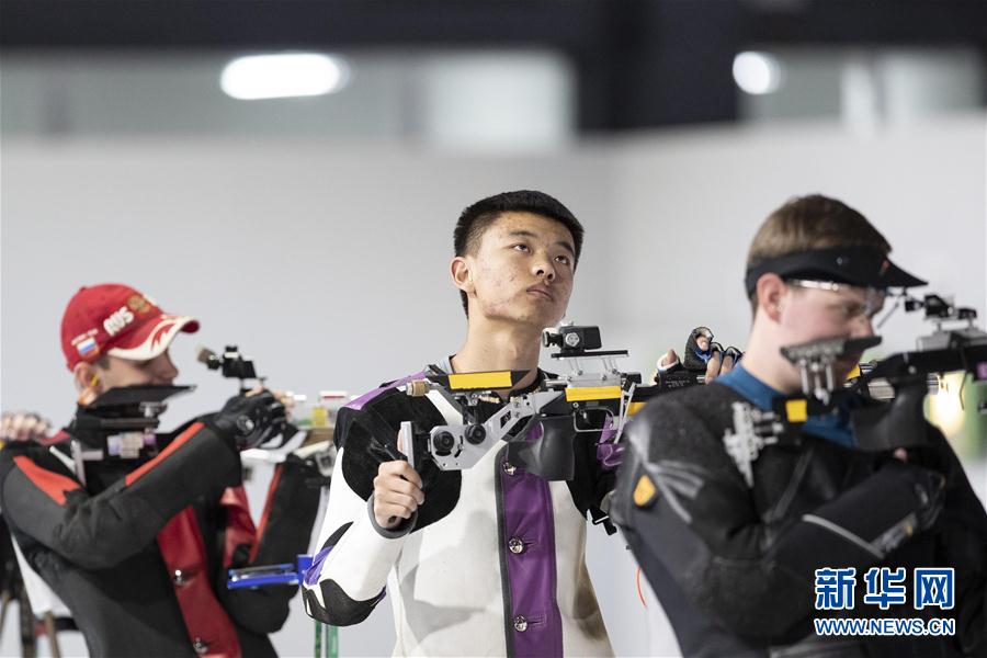↑10月7日,中国选手张常鸿(中)在决赛中。 当日,在阿根廷布宜诺斯艾利斯举行的第三届夏季青年奥林匹克运动会射击项目男子10米气步枪个人决赛中,中国选手张常鸿以205.6环的成绩获得第四名。新华社记者李明摄