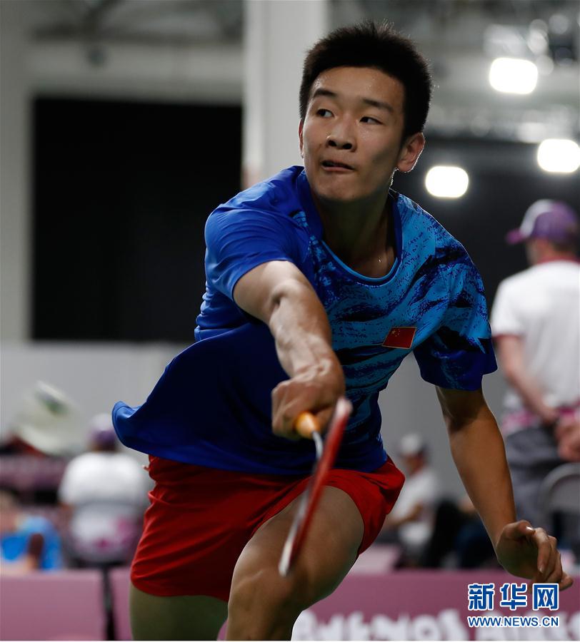 ↑10月7日,中国选手李诗沣在比赛中。 当日,在第三届夏季青年奥林匹克运动会羽毛球男子单打D组比赛中,中国选手李诗沣以2比0战胜西班牙选手托莱达诺。 新华社记者王丽莉摄