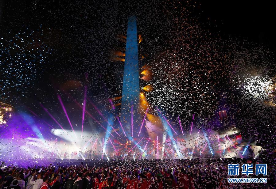 ↑10月6日,第三届夏季青年奥林匹克运动会开幕式在阿根廷首都布宜诺斯艾利斯地标建筑方尖碑前举行。图为开幕式现场。新华社记者孟永民摄