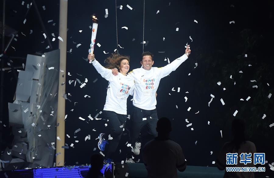 ↑10月6日,阿根廷运动员卡兰萨(左)、伊瓦拉在开幕式上传递火炬。 当日,第三届夏季青年奥林匹克运动会开幕式在阿根廷首都布宜诺斯艾利斯地标建筑方尖碑前举行。 新华社记者李俊东摄