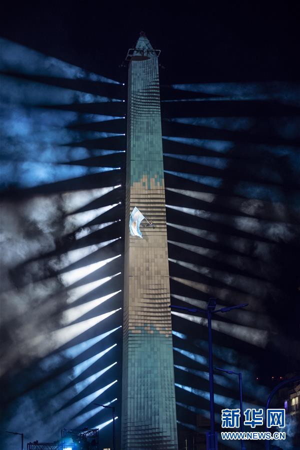 新华社照片,布宜诺斯艾利斯(阿根廷),2018年10月7日 (青奥会)(25)第三届夏季青奥会开幕 10月6日,演员挥舞阿根廷国旗在方尖碑上进行开幕式表演。 当日,第三届夏季青年奥林匹克运动会开幕式在阿根廷首都布宜诺斯艾利斯地标建筑方尖碑前举行。 新华社记者李明摄