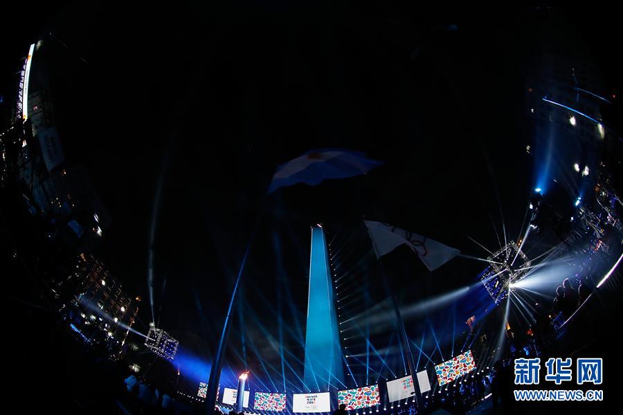 ↑10月6日,第三届夏季青年奥林匹克运动会开幕式在阿根廷首都布宜诺斯艾利斯地标建筑方尖碑前举行。 图为开幕式现场。 新华社记者王丽莉摄