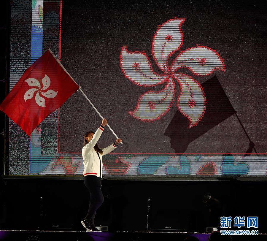 ↑10月6日,中国香港体育代表团旗手在开幕式上入场。 当日,第三届夏季青年奥林匹克运动会开幕式在阿根廷首都布宜诺斯艾利斯地标建筑方尖碑前举行。 新华社记者王丽莉摄
