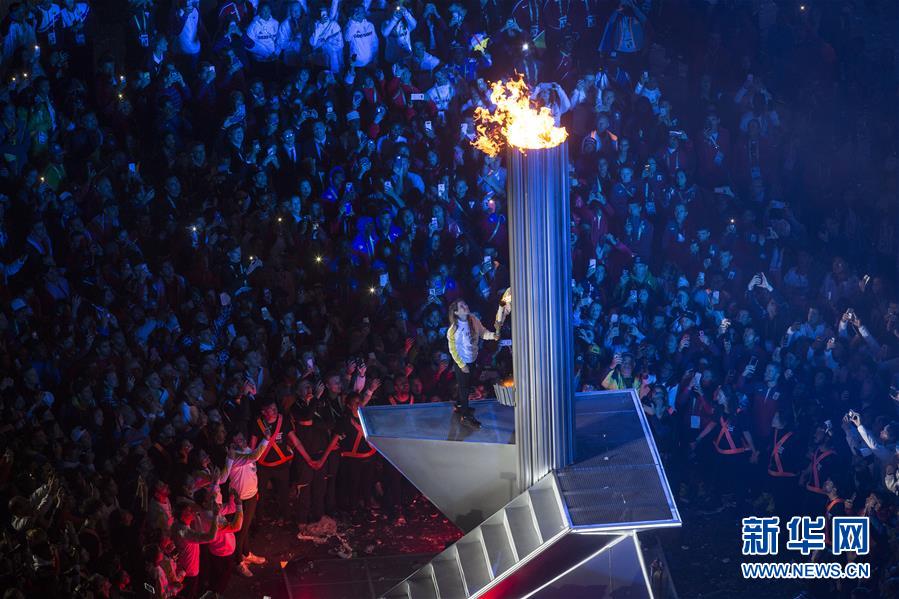 ↑10月6日,第三届夏季青年奥林匹克运动会开幕式在阿根廷首都布宜诺斯艾利斯地标建筑方尖碑前举行。 图为主火炬被点燃。 新华社发(马丁·萨巴拉摄)