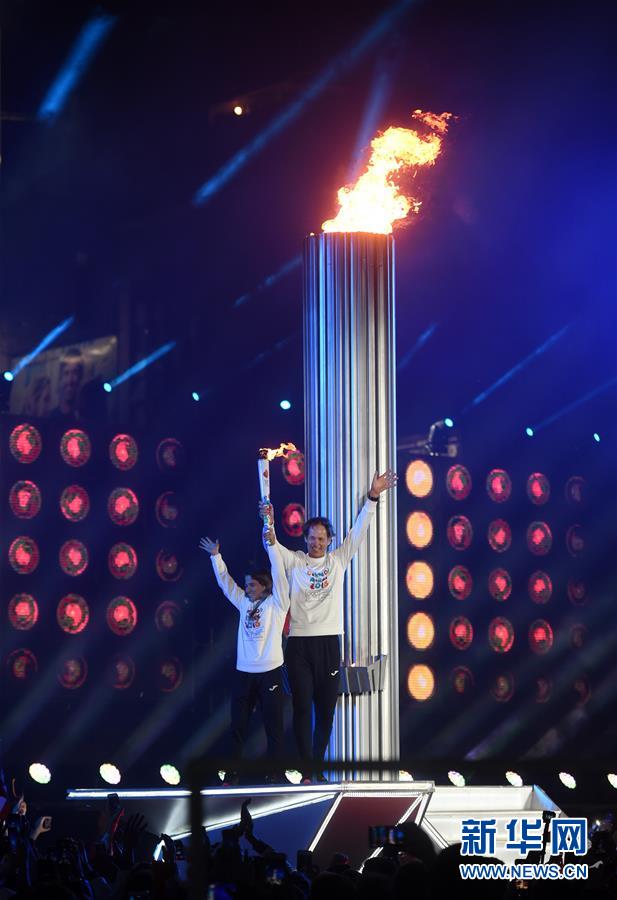 ↑10月6日,阿根廷柔道运动员帕雷托(左)、帆船运动员兰赫点燃主火炬。 当日,第三届夏季青年奥林匹克运动会开幕式在阿根廷首都布宜诺斯艾利斯地标建筑方尖碑前举行。 新华社记者李俊东摄