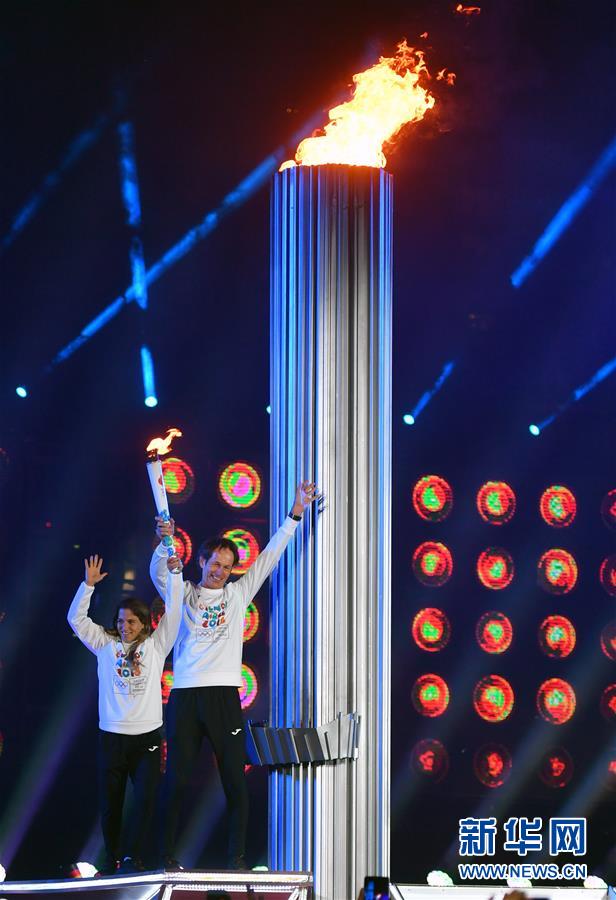 ↑10月6日,阿根廷柔道运动员帕雷托(左)、帆船运动员兰赫点燃主火炬。 当日,第三届夏季青年奥林匹克运动会开幕式在阿根廷首都布宜诺斯艾利斯地标建筑方尖碑前举行。 新华社记者朱峥摄