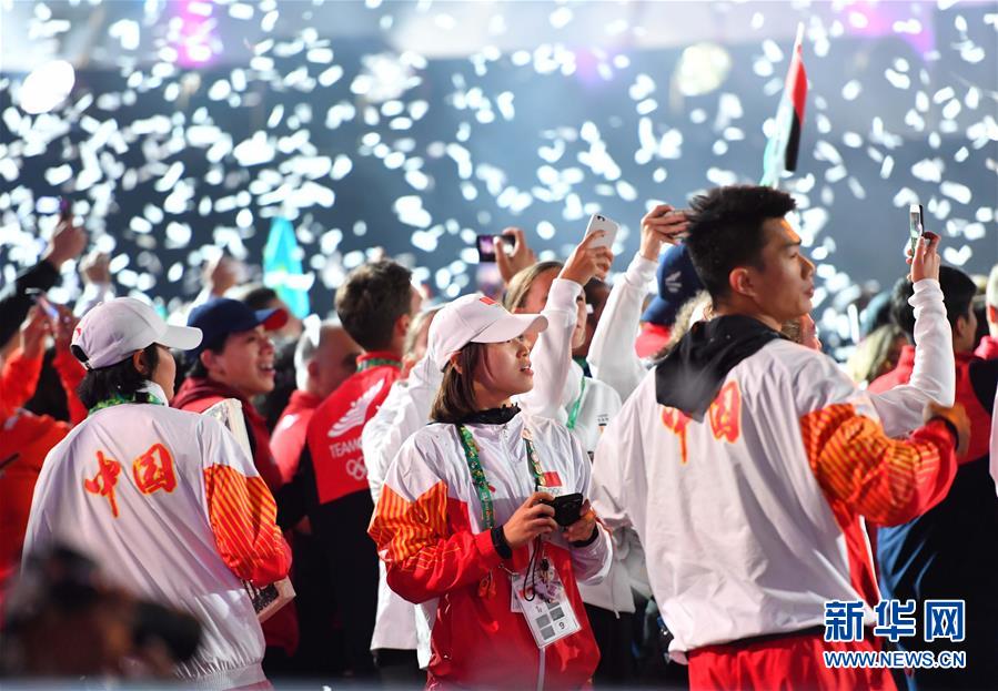↑10月6日,中国代表团成员在开幕式上。当日,第三届夏季青年奥林匹克运动会开幕式在阿根廷首都布宜诺斯艾利斯地标建筑方尖碑前举行。新华社记者朱峥摄