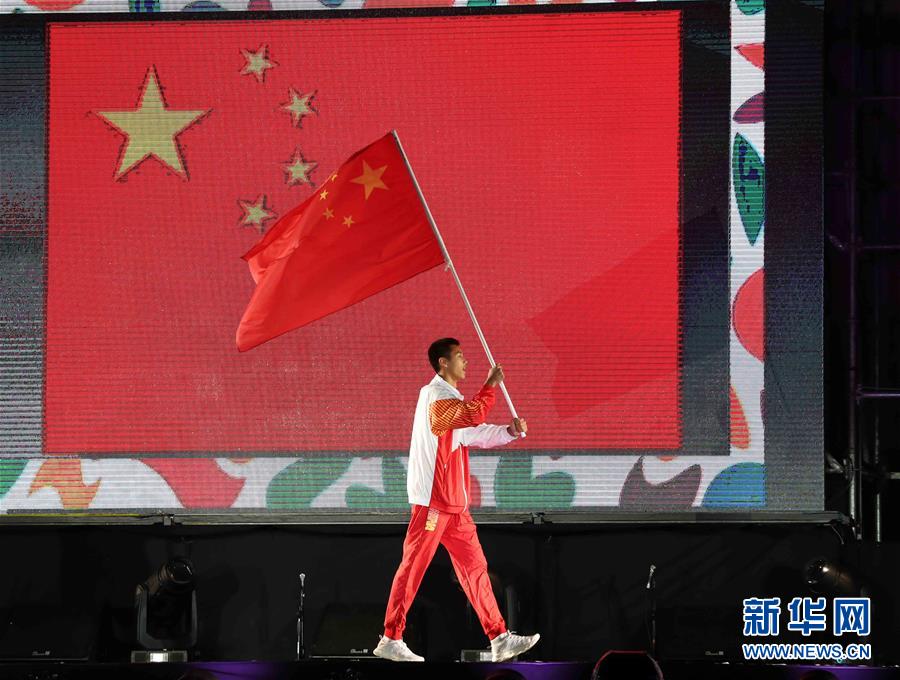 ↑10月6日,中国代表团旗手王云章在开幕式上高举国旗入场。当日,第三届夏季青年奥林匹克运动会开幕式在阿根廷首都布宜诺斯艾利斯地标建筑方尖碑前举行。新华社记者孟永民摄