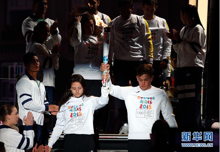 ↑10月6日,火炬手们手举火炬从移动舞台走向主舞台。当日,第三届夏季青年奥林匹克运动会开幕式在阿根廷首都布宜诺斯艾利斯地标建筑方尖碑前举行。新华社记者王丽莉摄