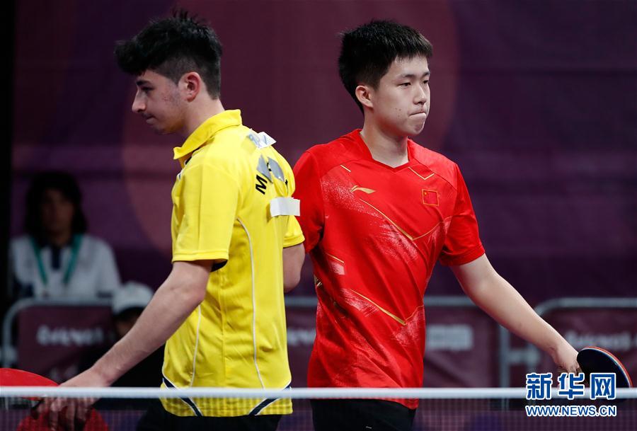 10月7日,中国选手王楚钦(右)在比赛后与对手摩尔多瓦共和国选手乌尔苏握手。 当日,在阿根廷布宜诺斯艾利斯举行的第三届夏季青年奥林匹克运动会乒乓球男子单打预选赛F组比赛中,中国选手王楚钦以4比0战胜摩尔多瓦共和国选手乌尔苏。 新华社记者王丽莉摄