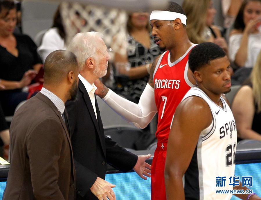 10月7日,火箭队球员安东尼(右二)在比赛间隙同马刺队主教练波波维奇(左二)交谈。 当日,在NBA季前赛中,休斯敦火箭队客场以108比93战胜圣安东尼奥马刺队。 新华社发 (宋穹摄)