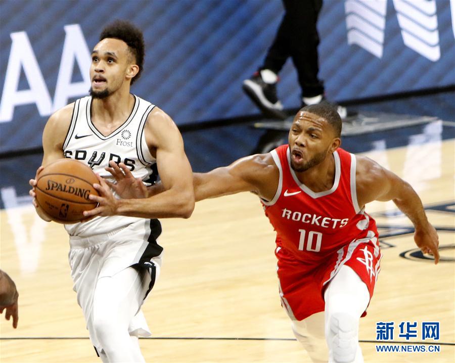 10月7日,马刺队球员怀特(左)在比赛中突破火箭队球员戈登的防守。 当日,在NBA季前赛中,休斯敦火箭队客场以108比93战胜圣安东尼奥马刺队。 新华社发 (宋穹摄)