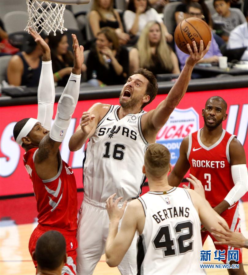 10月7日,火箭队球员安东尼(左一)在比赛中防守马刺队球员加索尔的进攻。 当日,在NBA季前赛中,休斯敦火箭队客场以108比93战胜圣安东尼奥马刺队。 新华社发 (宋穹摄)