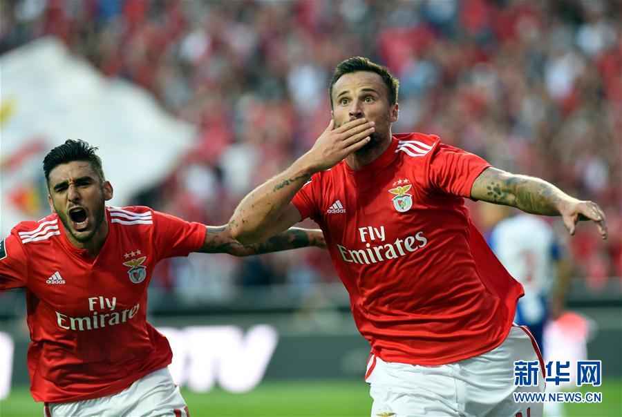 10月7日,本菲卡队球员塞费罗维奇(右)进球后庆祝。 当日,在葡萄牙首都里斯本光明球场举行的2018/2019赛季葡萄牙足球超级联赛第7轮比赛中,本菲卡队主场以1比0战胜波尔图队。 新华社记者章亚东摄