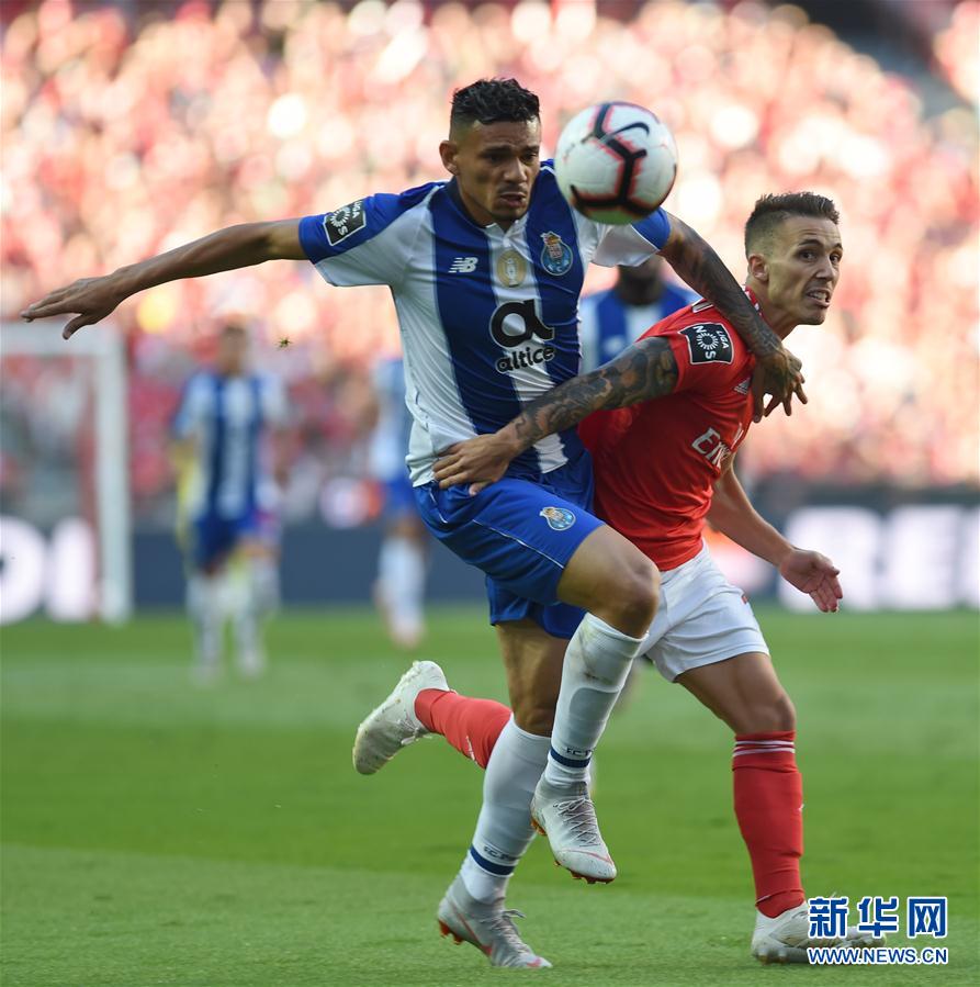 10月7日,本菲卡队球员格里马尔多(右)与波尔图队球员苏亚雷斯在比赛中拼抢。 当日,在葡萄牙首都里斯本光明球场举行的2018/2019赛季葡萄牙足球超级联赛第7轮比赛中,本菲卡队主场以1比0战胜波尔图队。 新华社记者章亚东摄