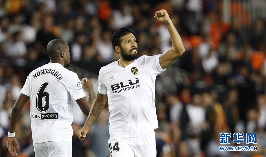 10月7日,巴伦西亚队球员加拉伊(右)在比赛中庆祝进球。 当日,在2018/2019赛季西班牙足球甲级联赛第8轮比赛中,巴塞罗那队客场以1比1战平巴伦西亚队。 新华社/美联